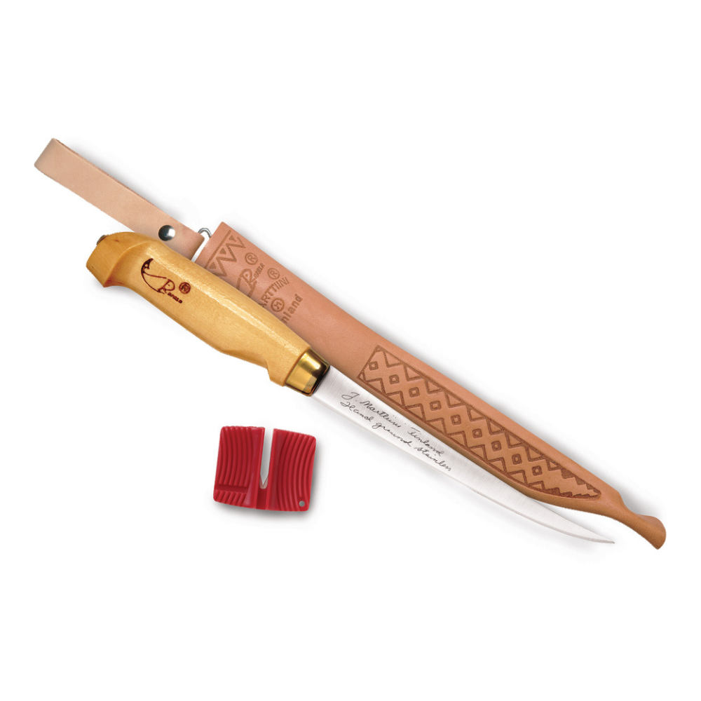 Made by Marttiini, the makers of premium Rapala fillet knives for over 50 years.More guts than any other knife, this is the one that taught the world to fillet. A favorite since the early days of Normark® with over 100 million sold to date, this knife is used in more fishing camps, on more charter boats and by more fisherman than any other fillet knife in the world. Progressively tapered, flexible, full-tang blade of European stainless steel that takes and holds an ultra-sharp edge is securely anchored in legendary birch handle. All protected by a fine tooled leather Laplander sheath with 'safety-first' free-swing belt loop that always keeps sheath and blade clear of the body. With four blade sizes to choose from, there's one just right for every fish cleaning chore. Includes easy-to-use single-stage sharpener that keeps blade razor sharp.